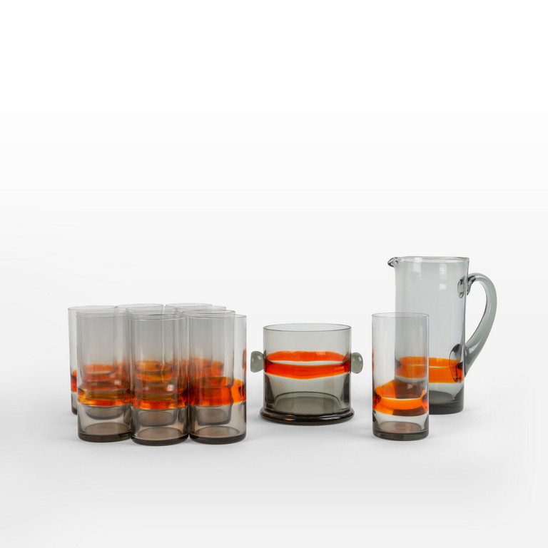 Dodici bicchieri una caraffa e un portaghiaccio.