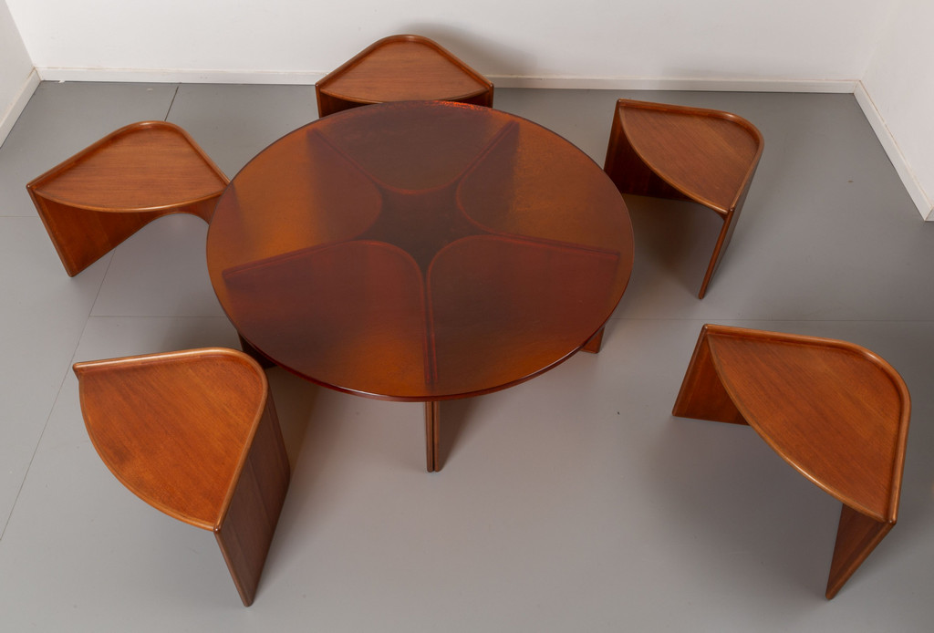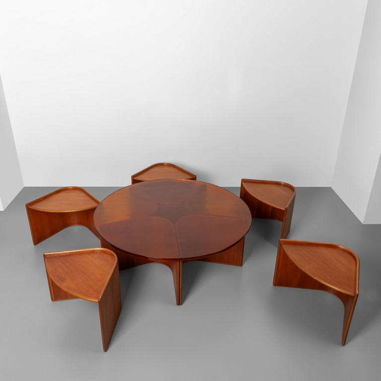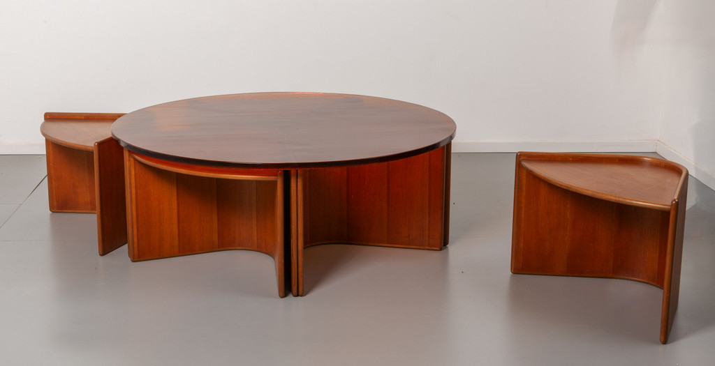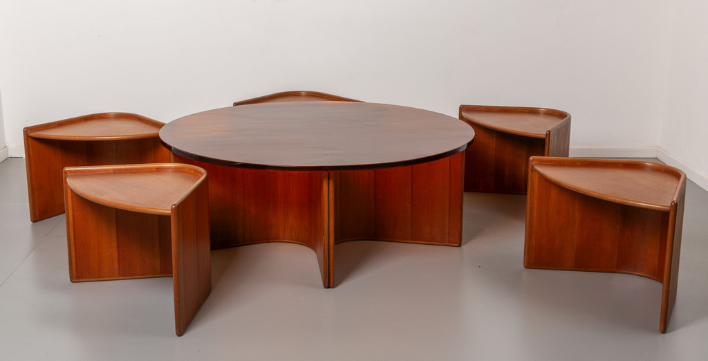 UN GRANDE TAVOLINO E CINQUE POUFS anni '70.