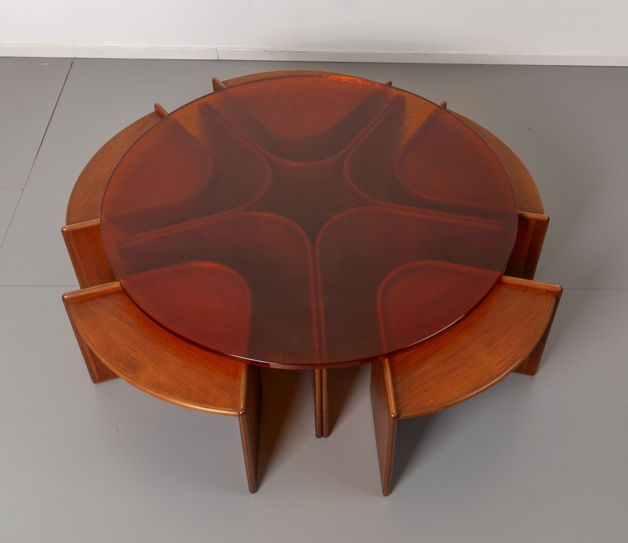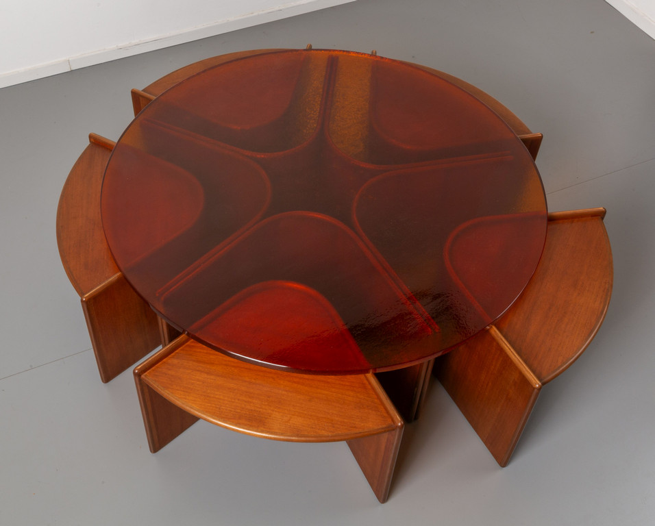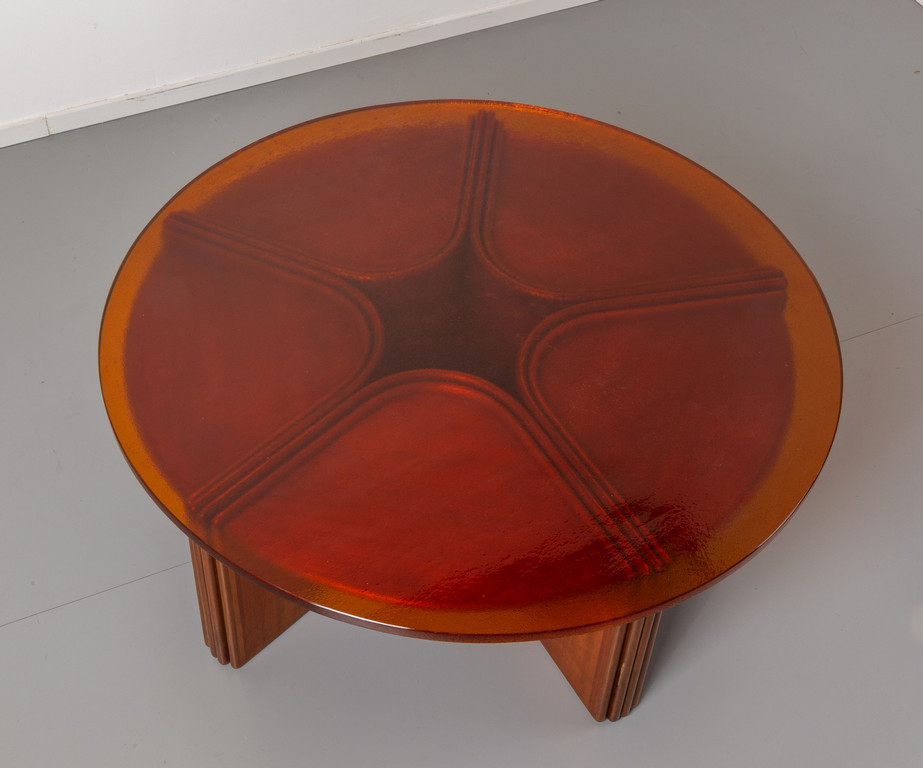 Walnut veneered wood thick colored crystal with an embossed effect on the lower surface.