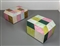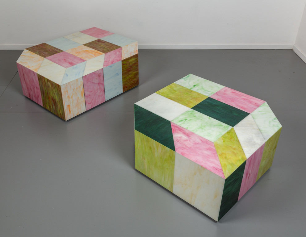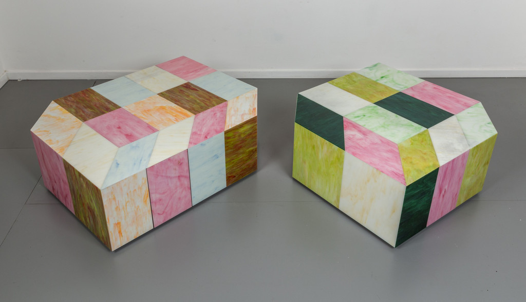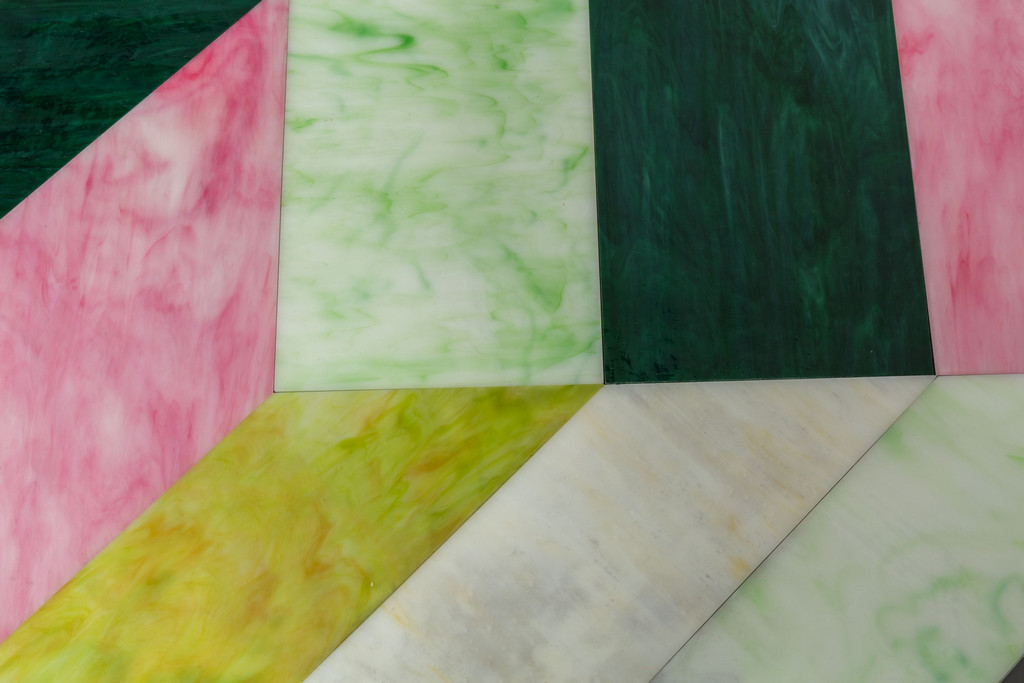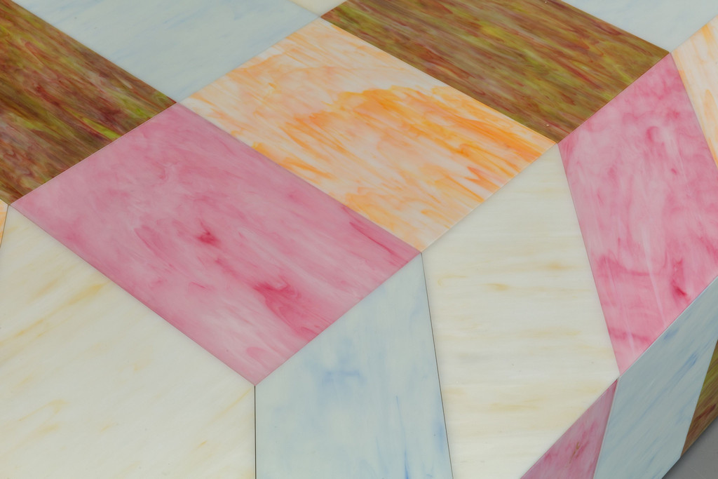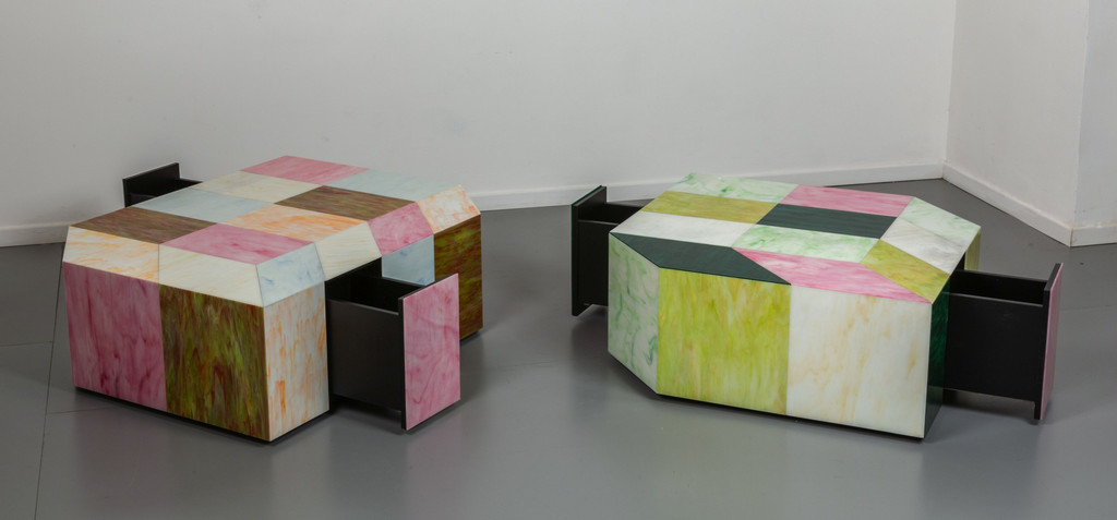 Strutture in legno rivestite da un mosaico di piastrelle in vetro colato con colorazioni variegate.