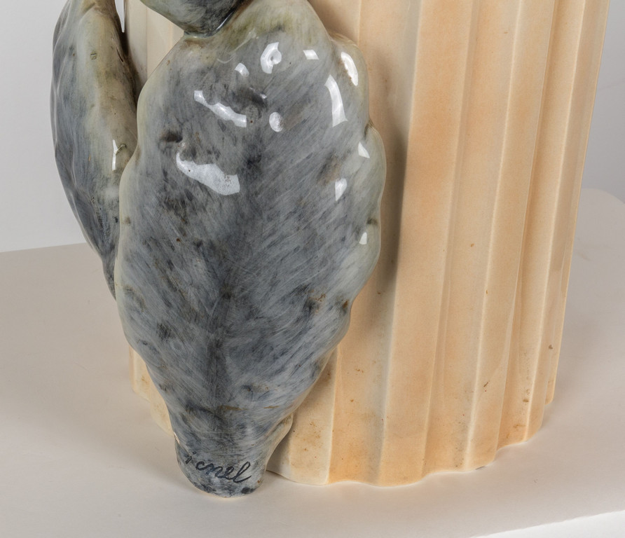 Una grande scultura in ceramica formata a colaggio e smaltata in policromia.